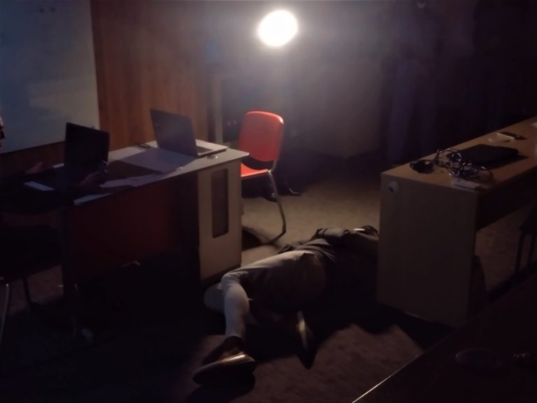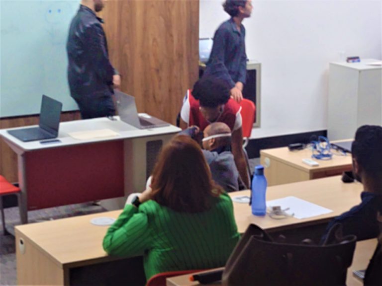 Já o grupo da aluna Camila Silva, formado por alunos do 3º e 4º período, ficaram com o tema Saúde mental e trabalho. Eles foram incentivados pelos professores a abordar o tema de forma lúdica, e usaram a experiência em teatro para produzir uma peça sobre abuso no trabalho.