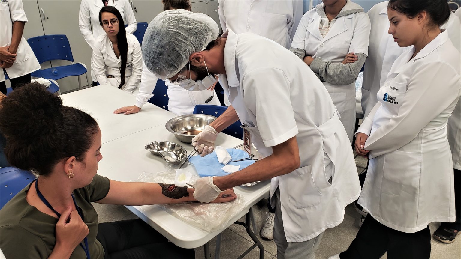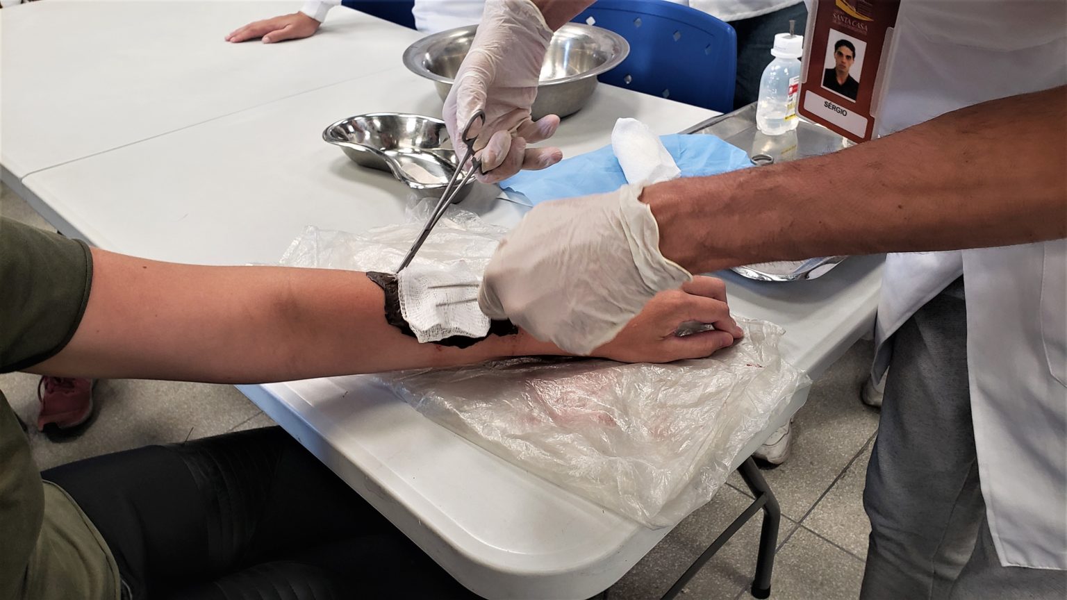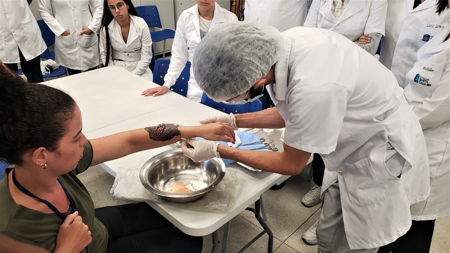 Na oportunidade, os alunos avaliaram e trataram uma lesão simulada por meio de maquiagem realística. Eles puderam ver o passo a passo da aplicação de um curativo, começando pelos procedimentos iniciais de emergência até o fechamento da lesão com faixa.